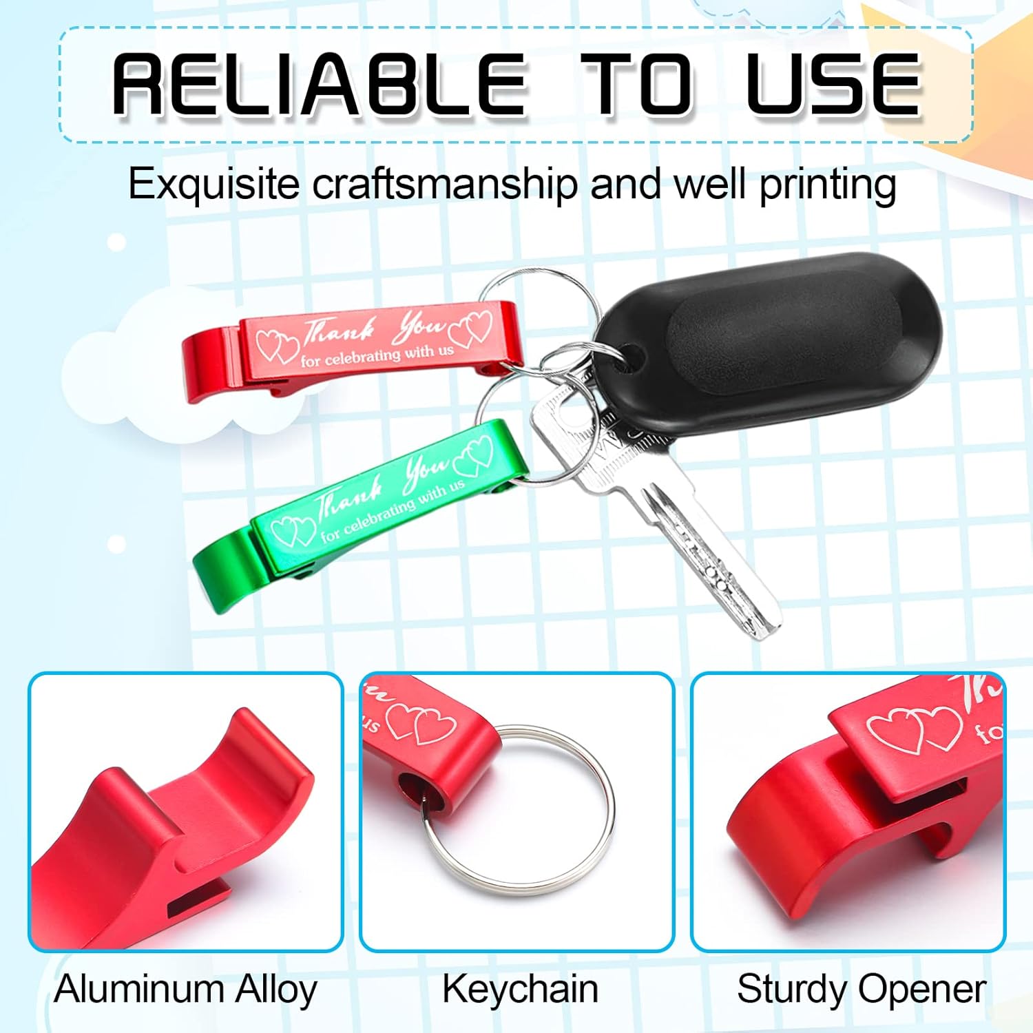 Overall, the 100 Pcs Bottle Opener Keychain Bulk is a versatile and practical choice for various celebrations. With their vibrant color options, portable size, and multifunctional design, these keychains are not only reliable and durable but also a cherished keepsake for guests. Whether it's a wedding, birthday, or any special occasion, these keychains make a thoughtful and functional gift that guests will appreciate and use long after the event.