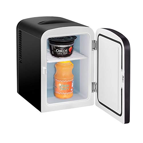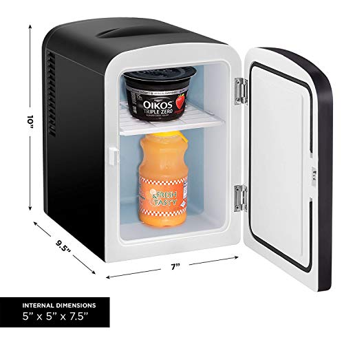 The compact, space-saving design of the Chefman Iceman Mini Portable Fridge makes it easy to transport. Despite its small size, it has a 4-liter capacity that can chill six 12 oz. cans. The removable shelf allows for storing a variety of items, such as milk, juice, yogurt, bottles, smoothies, cheese, fruit, coffee, soup, and more.
