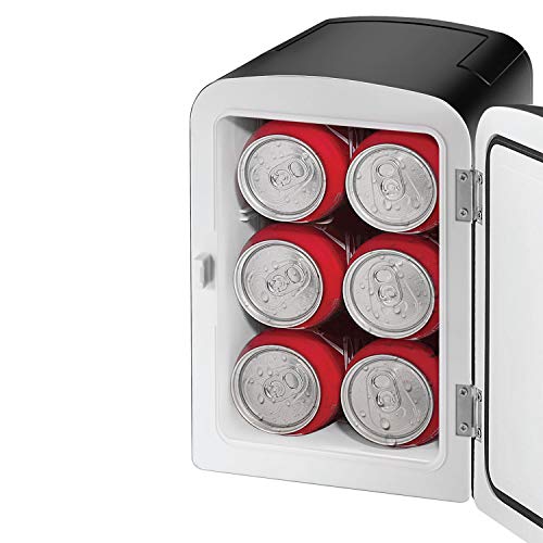 The fridge has a 4L capacity and can hold up to 6 12oz cans, although the internal design may require removing a plastic basket to fit certain items.