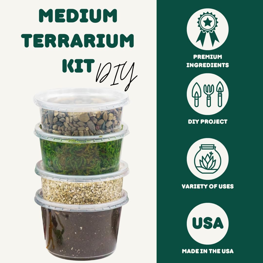 The Medium Terrarium Kit includes a 4.5’’x 2.25’’ container of Moss (Reindeer Moss, Forest Moss & Lichen), 4.5’’x 2.75’’ Potting Soil Blended with Activated Charcoal, 4.5”x 1.75” Gardening Vermiculite, 4.5”x 1.75” Pea Pebbles & River Stones, 1 oz fl Plant Food, Bamboo Tongs, Natural Hair Brush, (3) Miniature Dinos, Succulent Care Guide, Build & Care Guide, and Cute Farms Sticker. Save when compared to buying individual materials.
