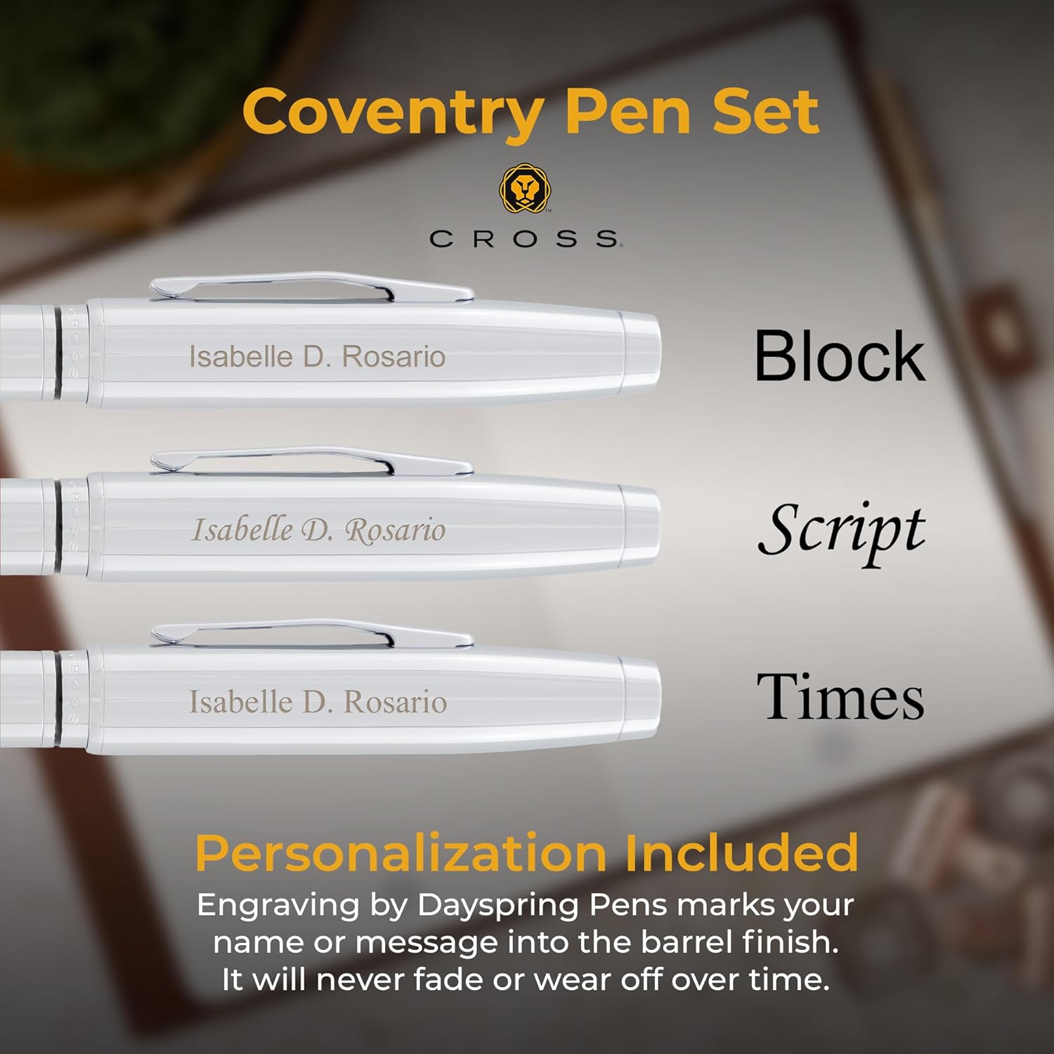 The Dayspring Pens Cross Pen Set stands out with its combination of elegance, customization, and superior functionality. Its durable construction and lustrous chrome finish make it a luxurious yet affordable choice for anyone seeking a high-quality writing instrument. With the added benefit of personalized engraving, this set makes for a unique and memorable gift, suitable for any special occasion.