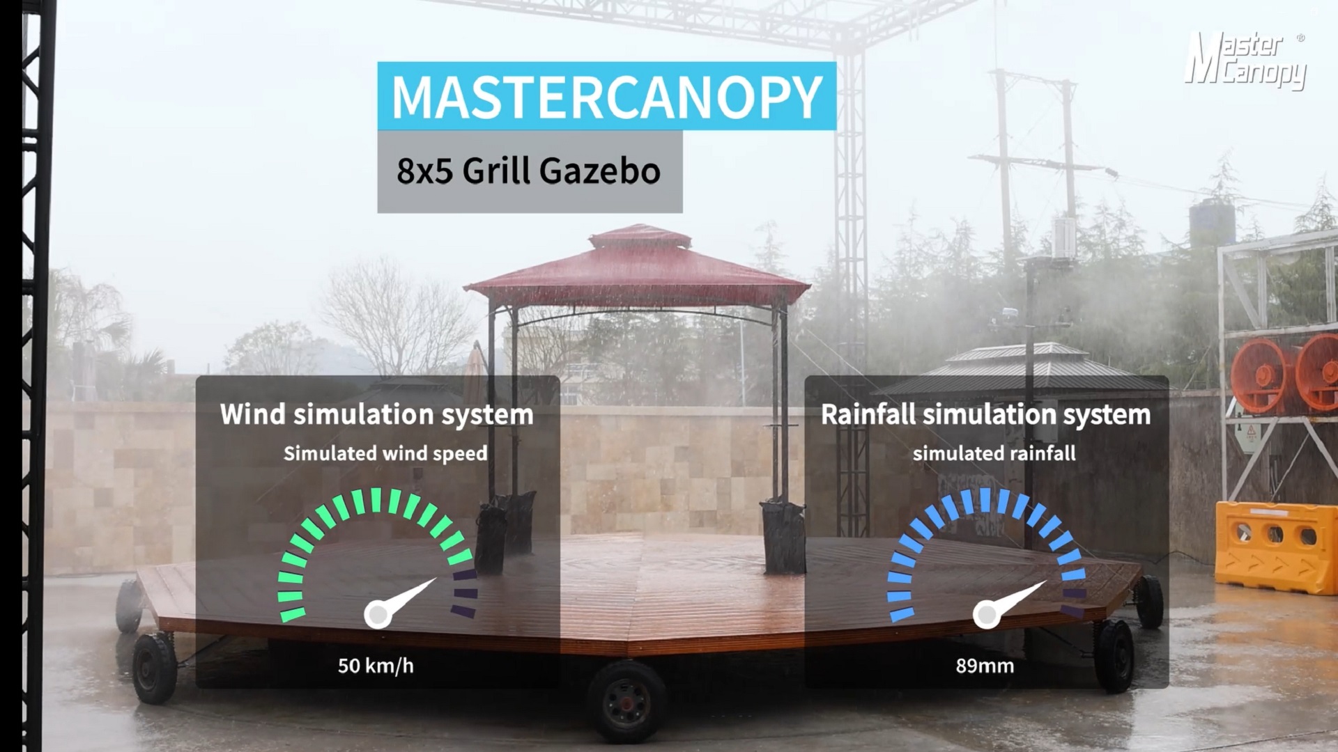 The MASTERCANOPY 8 x 5 Grill Gazebo comes with a rustproof steel frame that is both durable and stable. The design features four poles supporting the top, which effectively prevents water accumulation. The frame is powder-coated to resist oxidation and rust.