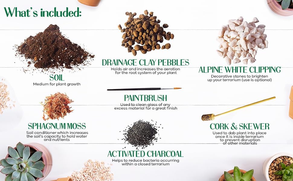 Quality and value define this USA-made Terrarium Kit. Its versatility allows it to be used in open, closed, or air terrariums, making it a wonderful gift for any season. This value-packed kit includes soil (1lb), activated charcoal (1.6oz), sphagnum moss (2.1oz), drainage clay pebbles (9oz), a paintbrush, decorative stones, and a wooden skewer with cork. The included ebook also labels each ingredient and provides in-depth care instructions, ensuring the longevity of your miniature ecosystem.