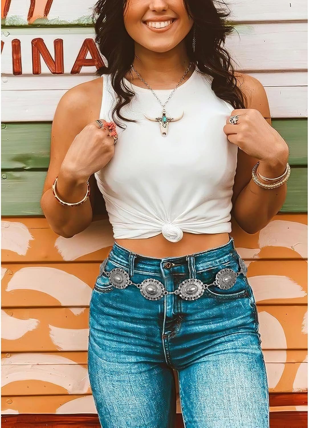 These western belts for women feature metal conchos that wrap the waist up to 31.5 inches and fit waists up to 39 inches with the extension chain.